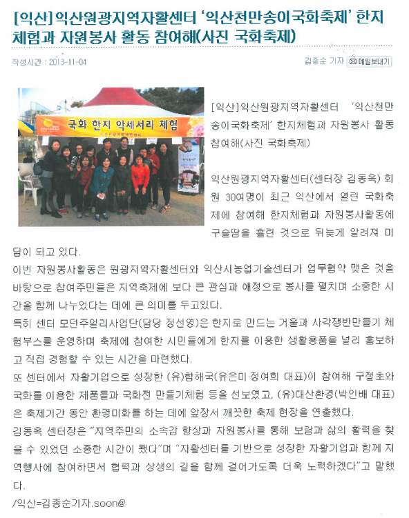 2014-01-22 [전라일보]원광자활, 익산천만송이국화축제 한지체험과 봉사활동