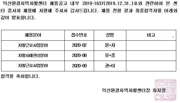 2020-01-22 2020년 신규 직원 채용 합격자 발표